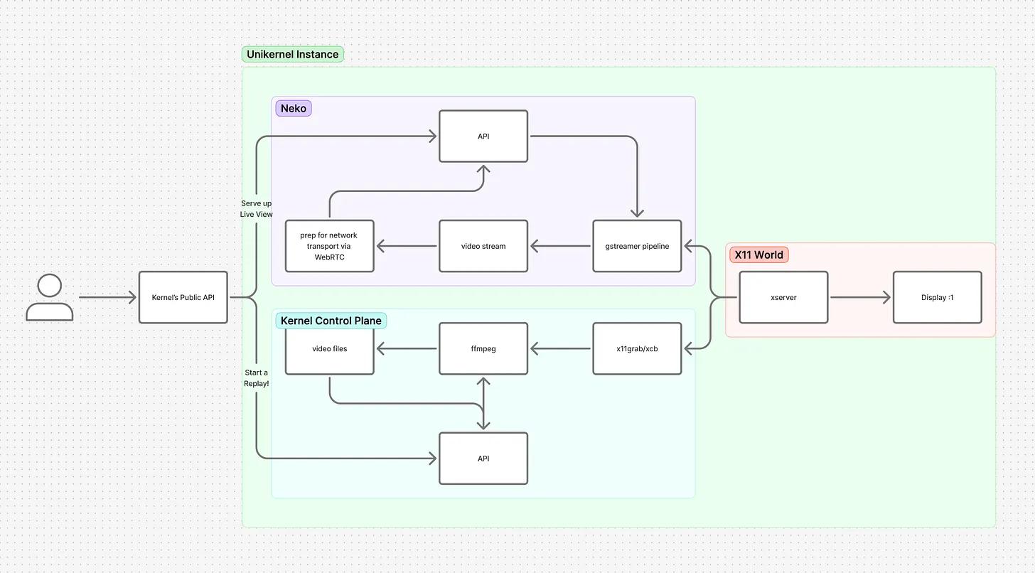 Based off our open source Chromium images, Kernel runs browsers inside lightweight, isolated unikernels orchestrated by our API. To support video replays: