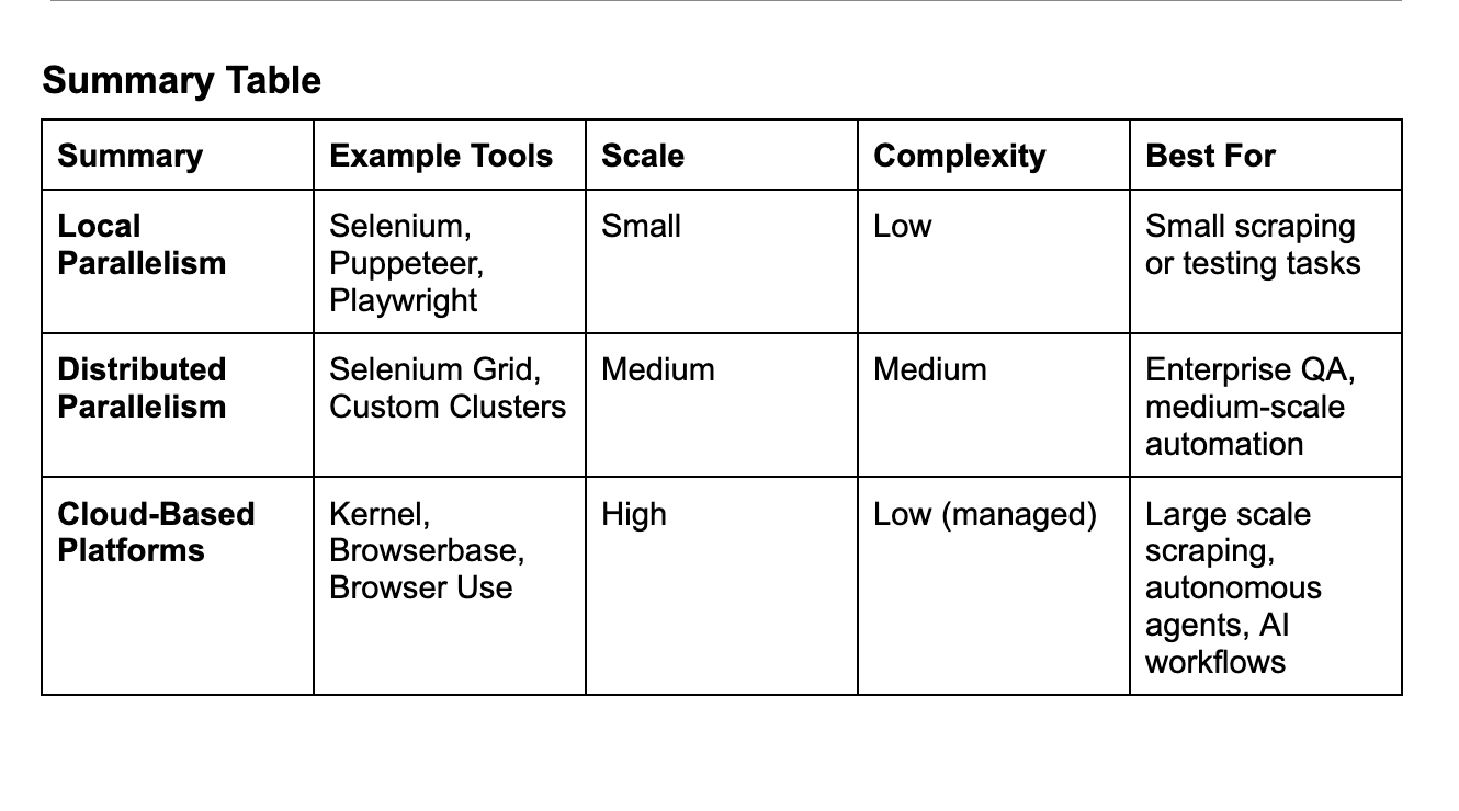 When it comes to scaling browser automation, there are three distinct approaches, each suited to different needs, resources, and complexity levels.